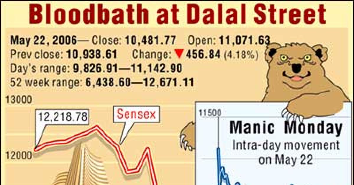 It was bloodbath at the Indian stock markets on May 22 like never before. The Sensex -- the benchmark 30-share sensitive index of the Bombay Stock Exchange -- plummetted by a nerve-rattling 1,111.71 points in intra-day trading. This is the largest fall in a single day ever witnessed in the history of the Indian stock markets.
