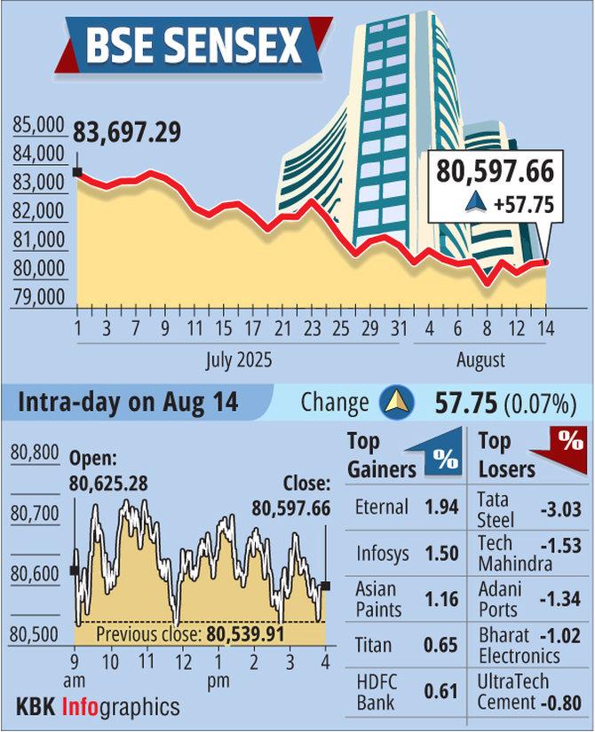 Extending gains to the second day, the 30-share BSE Sensex climbed 57.75 points or 0.07 per cent to settle at 80,597.66.