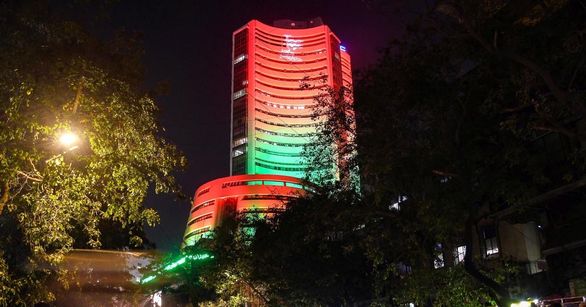 IMAGE: The Bombay Stock Exchange building is illuminated with tricolour lights for Republic Day. Photograph: PTI Photo.