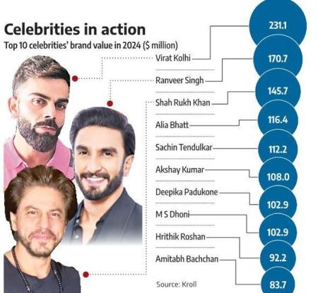 The cumulative brand value of the top 25 Indian celebrities in 2024 reached $2 billion, which increased by nine per cent compared to 2023, Kroll stated.