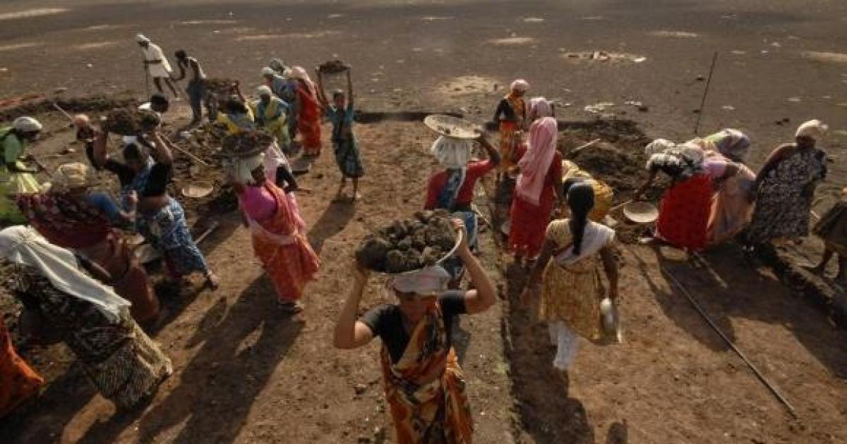 Labourers work on a dried lake to try and revive it under the National Rural Employment Guarantee Act (NREGA) at Ibrahimpatnam, on the outskirts of Hyderabad. Photograph:Krishnendu Halder/Reuters