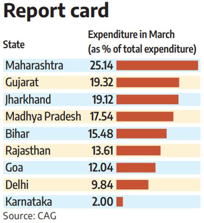 Most Indian states are bunching up their expenditure in the last month (March) of the financial year, an analysis of 2023-2024 state finance audit reports by the Comptroller and Auditor General (CAG) showed, cautioning against 'non-adherence to financial propriety'.