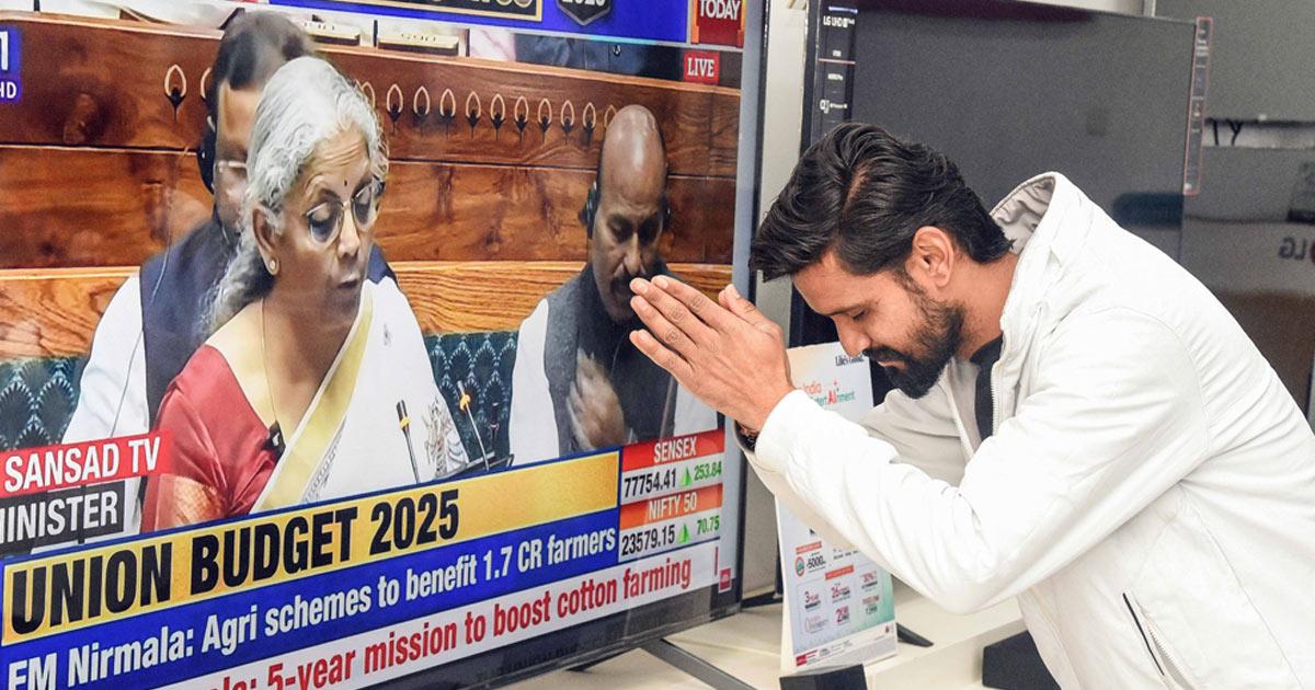 IMAGE: A grateful Indian bows down in front of a television screen in a Bikaner showroom during the live telecast of the Union Budget 2025, February 1, 2025. Photograph: ANI Photo
