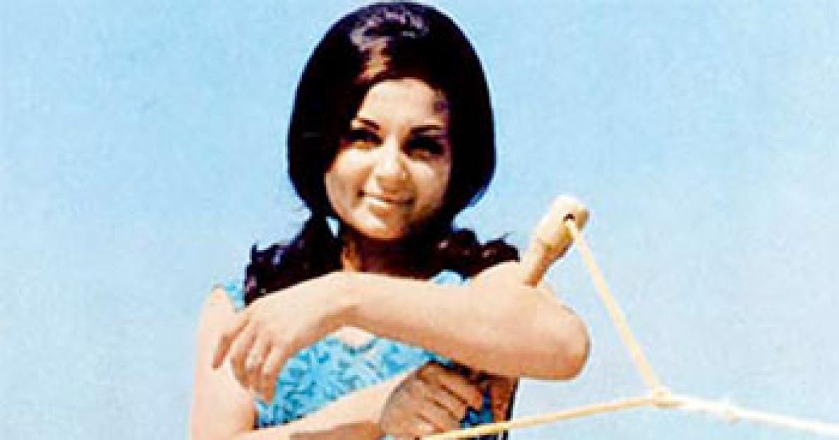 It's a lovely fawn-coloured churidar with gota patti embellishments worn by the svelte style icon whilst romancing Shammi Kapoor in the ditty Mera Dil Hai Tera from An Evening in Paris as well as Aamne Saamne's Kabhi Raat Din Hum Door, where she's paired opposite younger brother, Shashi.