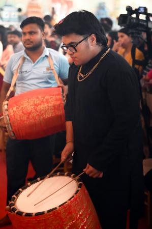 Swastik Bansal, Bappi Lahiri's grandson, beats on the dhol.