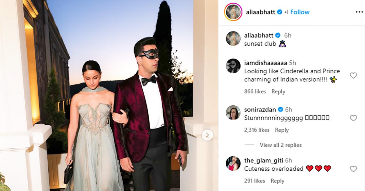 Alia Bhatt posted pictures of herself with husband Ranbir Kapoor from Anant Ambani and Radhika Merchant's pre-wedding masquerade party in Italy.