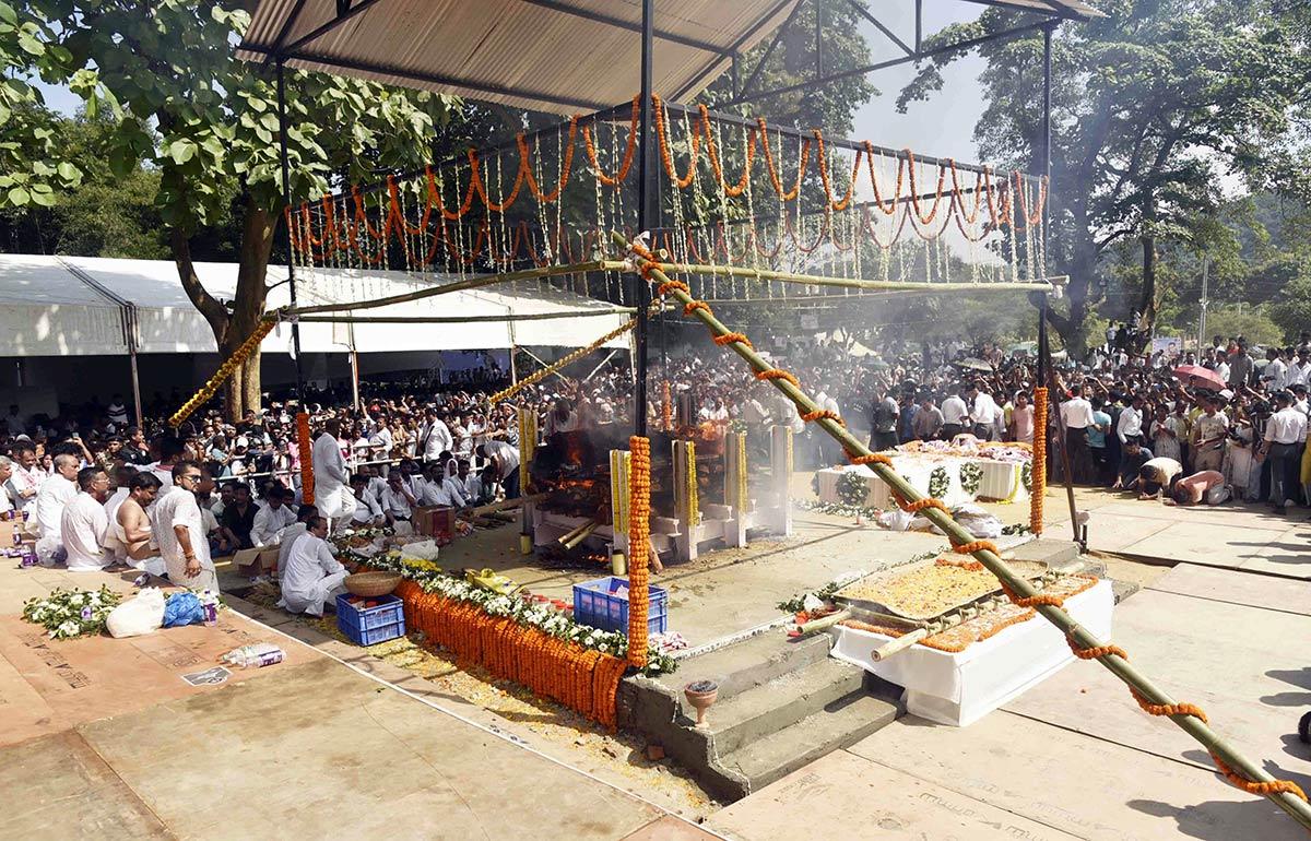 The family performed certain Vedic rituals while Union Ministers Sarbananda Sonowal, Kiren Rijiju and the chief minister placed wood on the pyre.