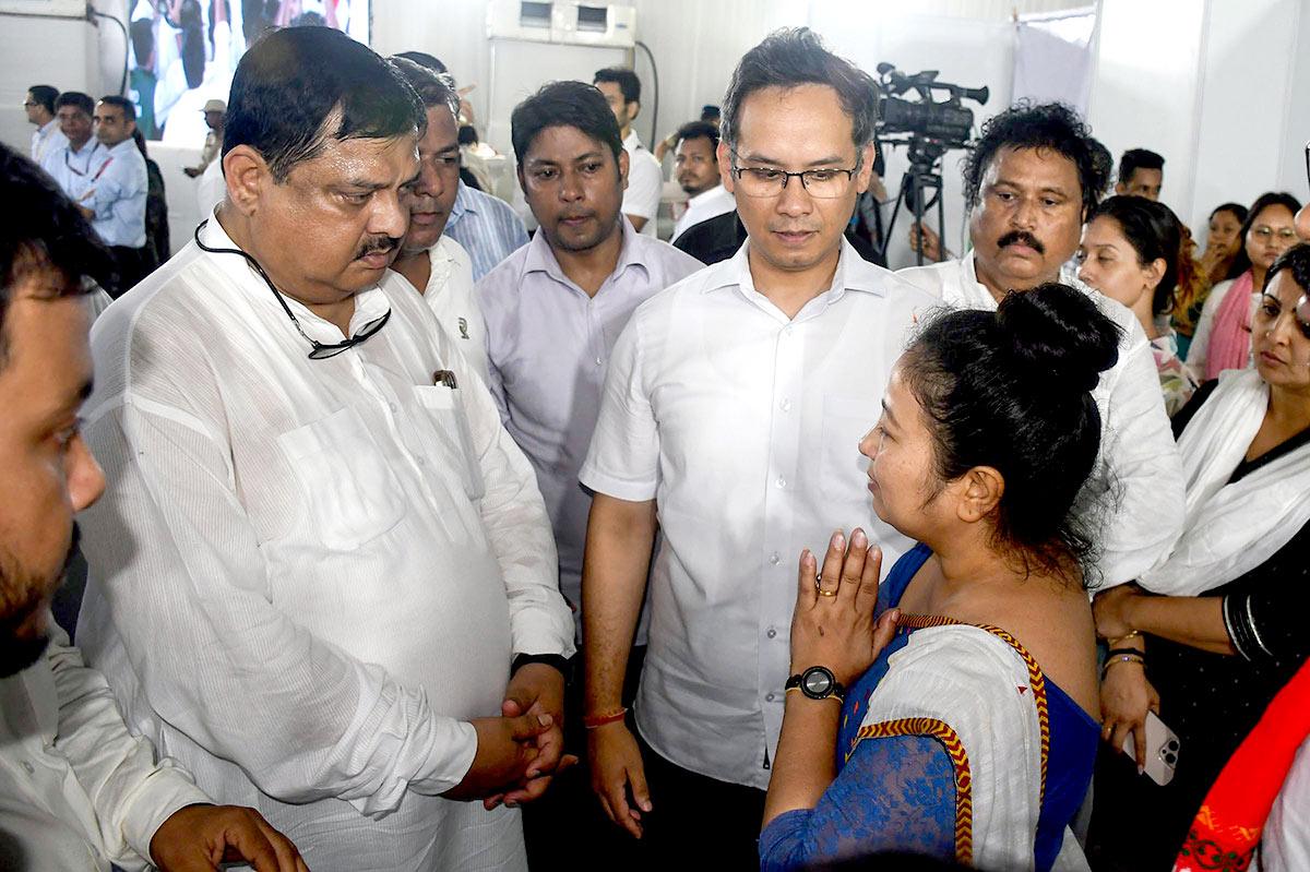 Sonowal, Margherita, the chief minister and leader of the opposition Debabrata Saikia went down on their knees to pay tributes to the singer.