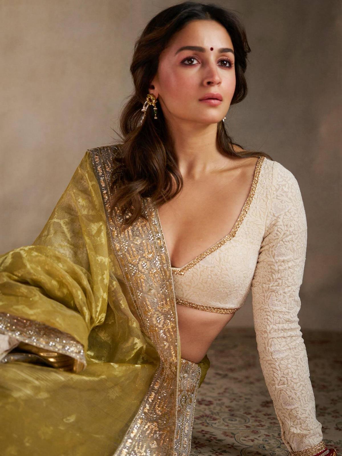 Alia Bhatt redefines old world opulence in her pista green sari teamed with an intricate chikankari blouse edged with zardozi hand-embroidery.