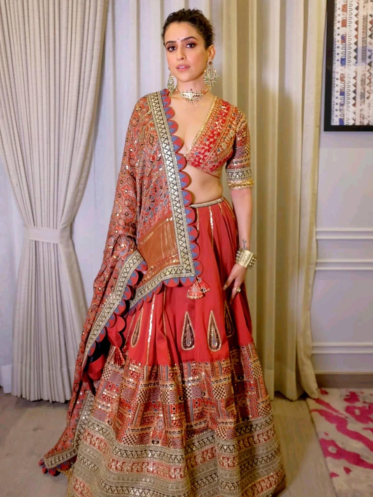 Sanya Malhotra nails her garba night ensemble donning a beautiful lehenga with a ruby encrusted ajrakh backless choli and a matching dupatta.
