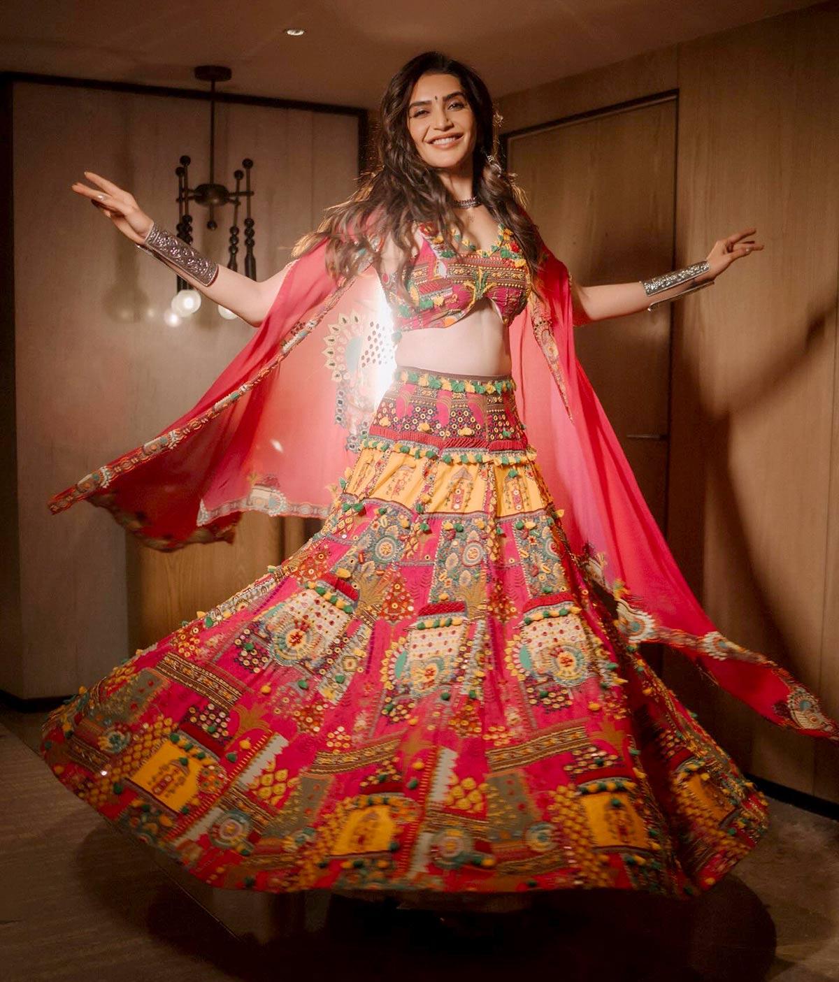 Karishma Tanna channels her inner Gujarati girl in a heavily embroidered colourful chaniya choli and a matching cape.