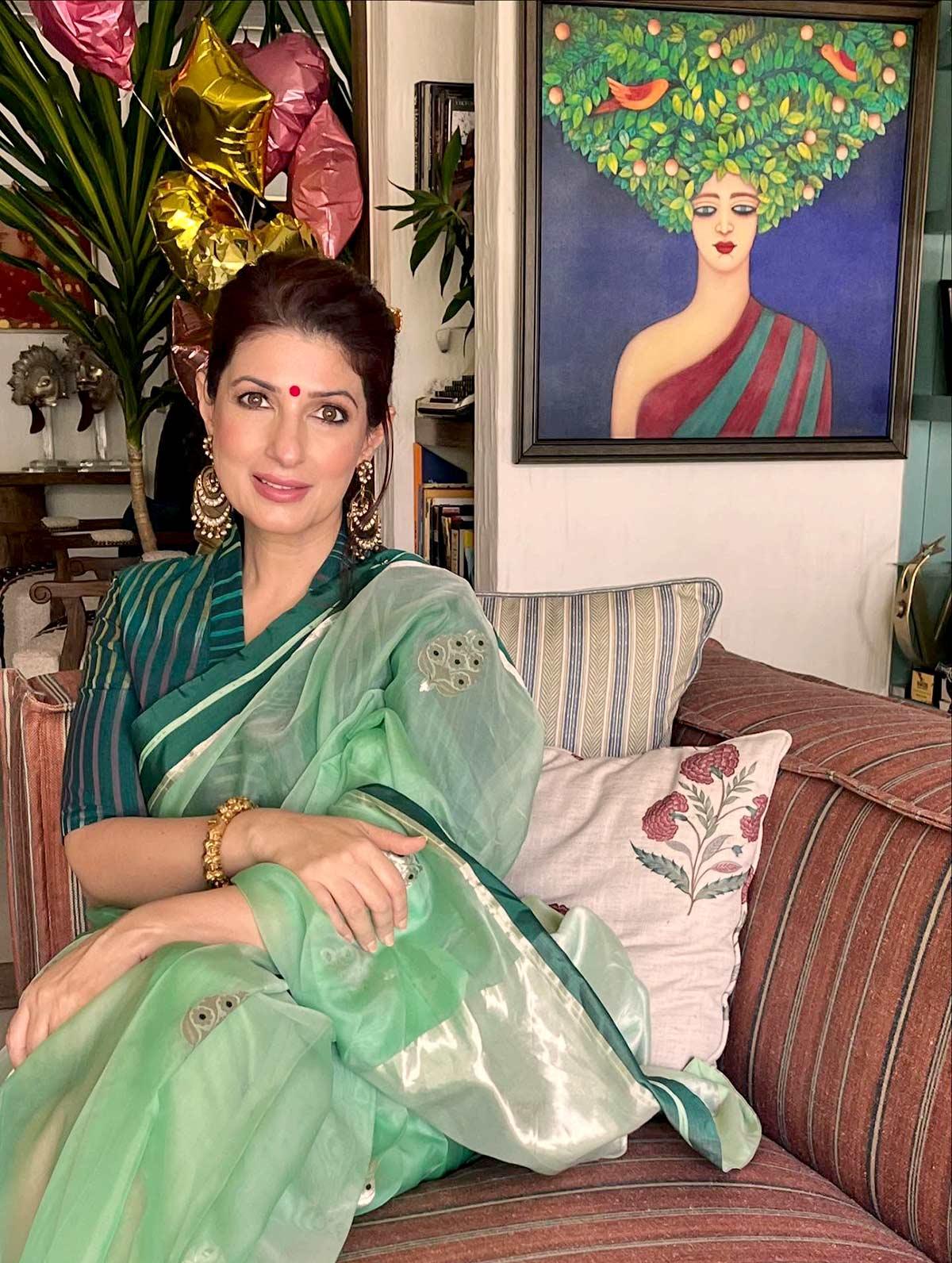 Looking pretty in green, Twinkle Khanna says her go-to-outfit for any occasion on a busy day is a sari and we totally get why.