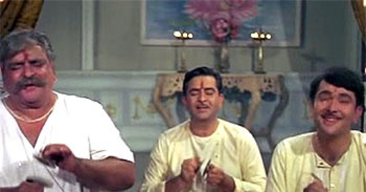There's some attempt to highlight the ignorant, Western-fixated youth ("Rabindranath Tagore? Shantiniketan ka headmaster tha!") but Randhir's Rajesh is largely progressive in his thoughts and sensitive to his father's feelings whereas Prithviraj Kapoor's Diwan Bahadur is more pig-headed than prudent in his unyielding support for convention.