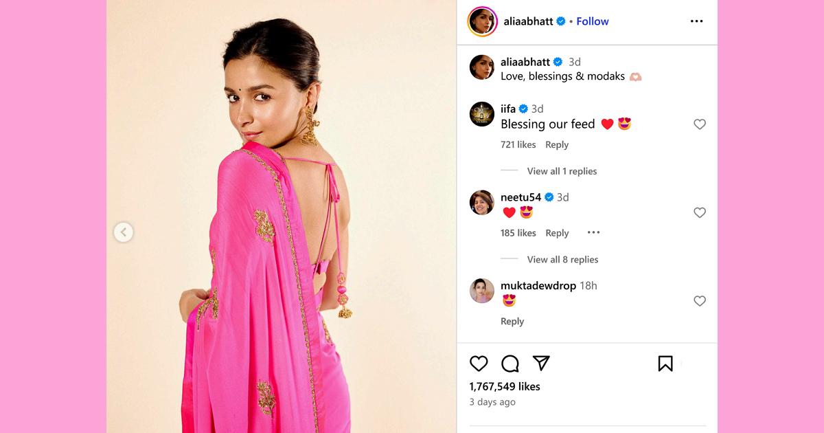 Alia Bhatt joins the festive fervour and glams up in a striking bright pink sari designed by Masaba Gupta.