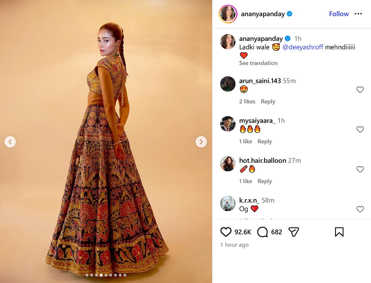 For the mehendi ceremony, Ananya looks stunning in a Mayyur Girotra lehenga, featuring rich embroidery and mirror work.
