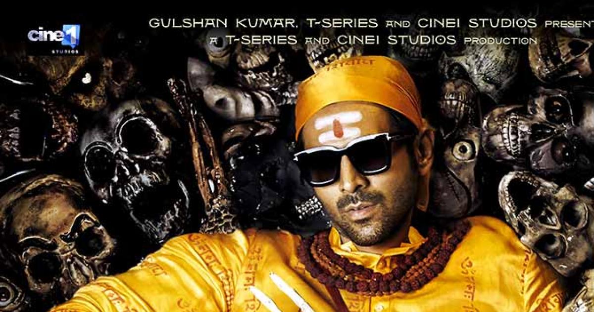 The poster sees Kartik holding a skeleton hand showing off a victory sign.