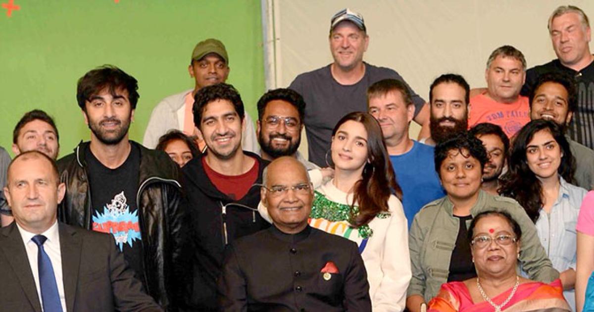 IMAGE: Bulgaria's President Rumen Radev, President Ram Nath Kovind and First Lady Savita Kovind, with the Brahmastra team, including Ranbir Kapoor, Director Ayan Mukerji and Alia Bhatt.