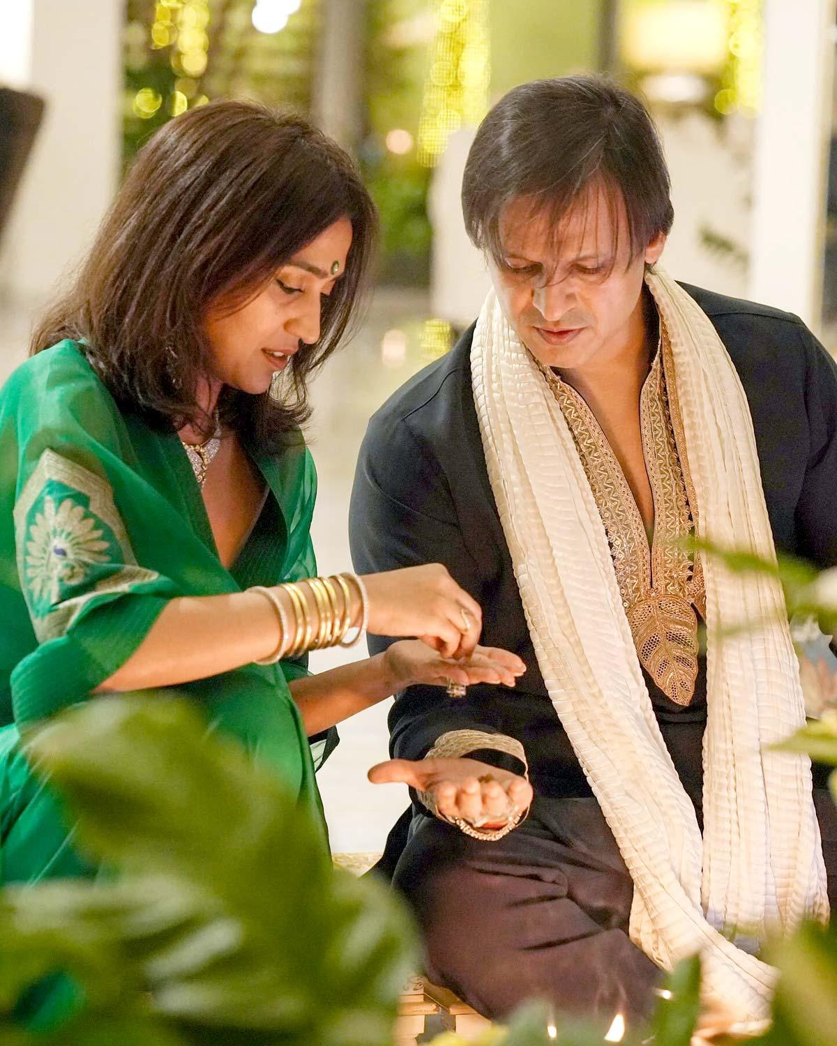 'The perfect formula: Prayers for the soul, people for the love, and parties for the memories. That's how you do Diwali. May the glow of a thousand lamps banish every shadow, and may the festival of lights bring new hope, prosperity, and success into all your lives. Happy Diwali, my Insta fam!', Vivek Oberoi, seen here with wife Priyanka Alva, tells us.