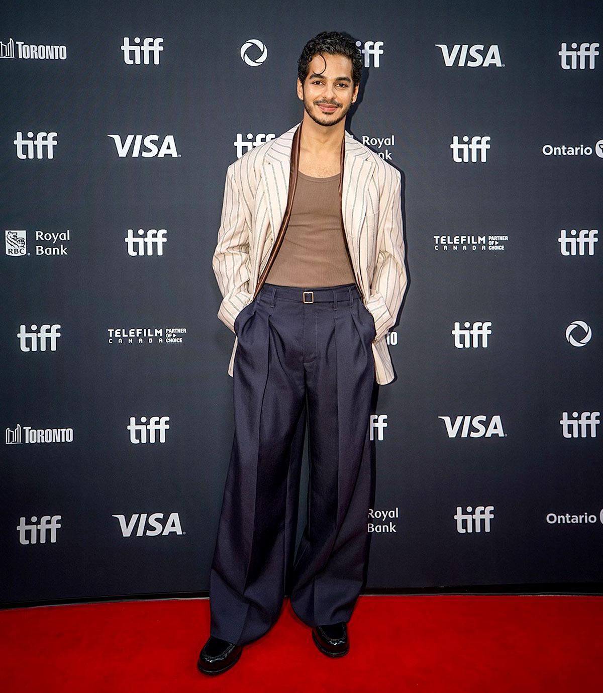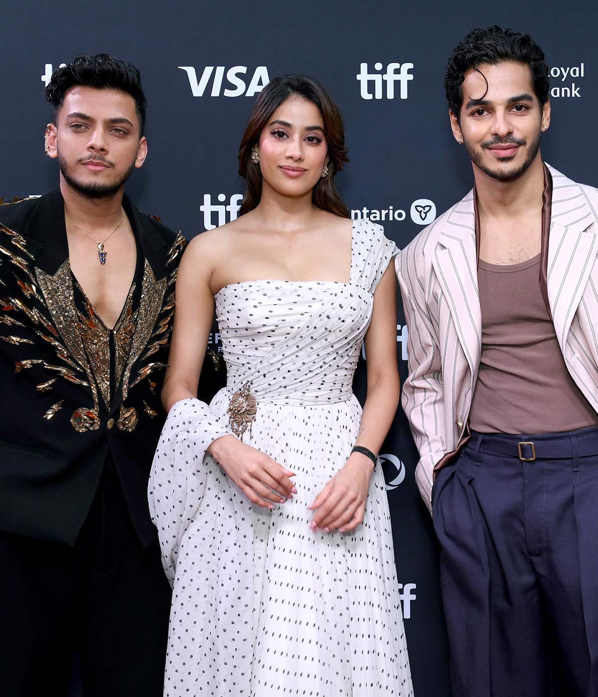 For the Homebound premiere, Janhvi picks a polka dotted white gown from Miu Miu, standing out from her handsome co-stars, Vishal Jethwa and Ishaan Khatter.