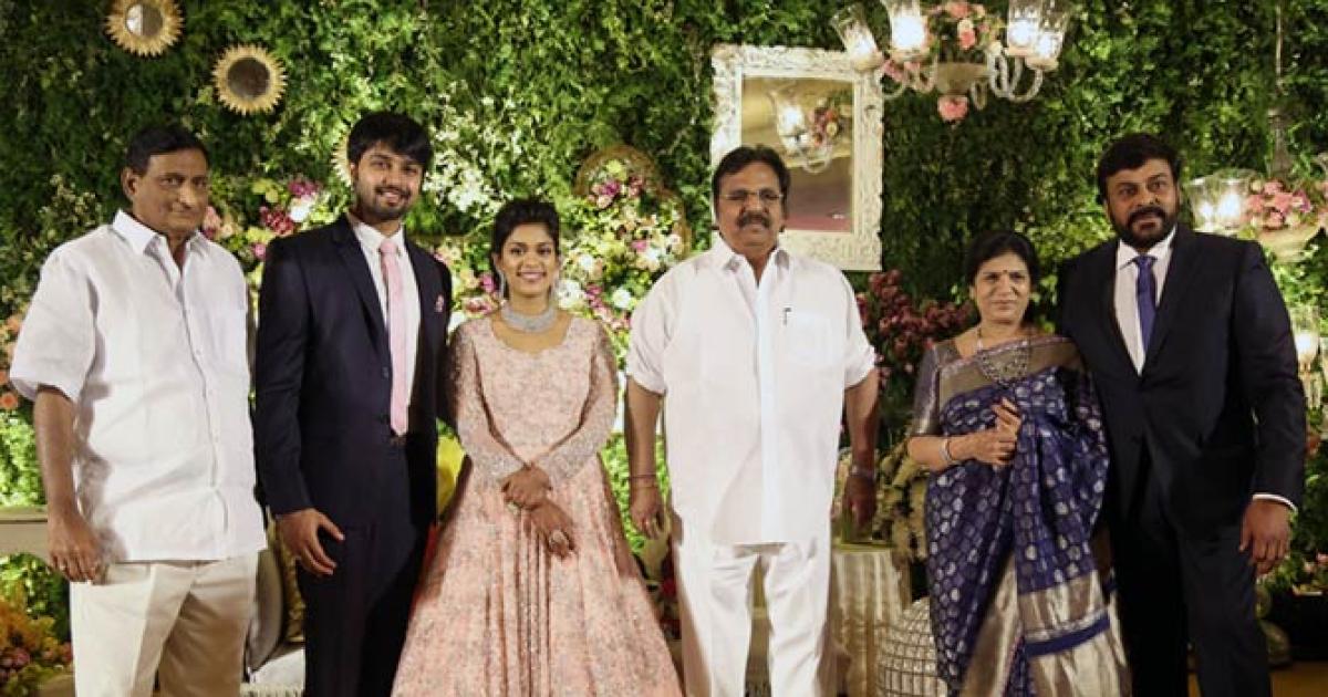IMAGE: Dasari Narayana Rao, third from right, with Chiranjeevi, right, at the Telugu movie superstar's daughter Sreeja's wedding, April 2016.