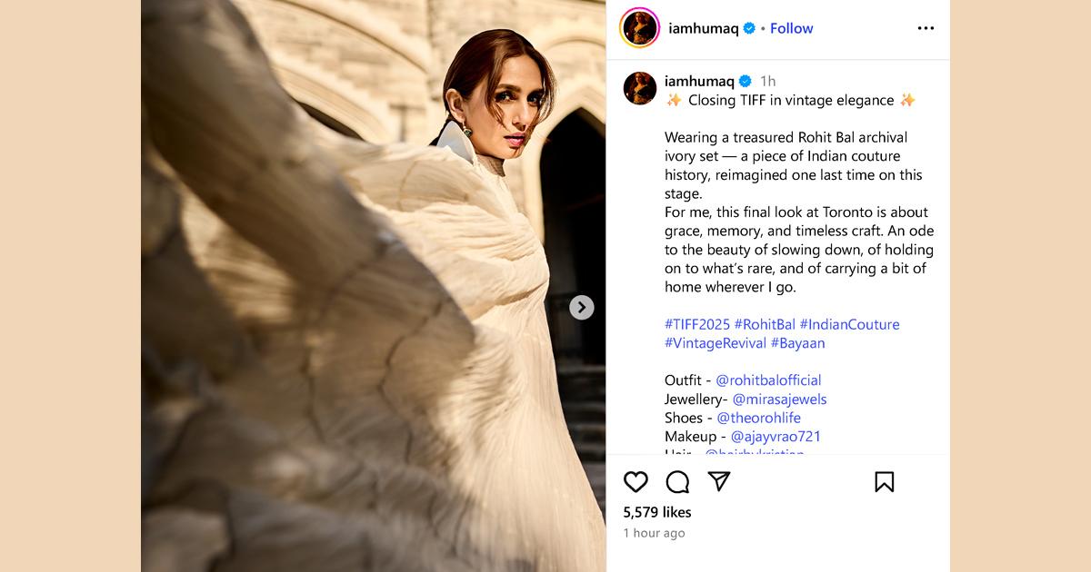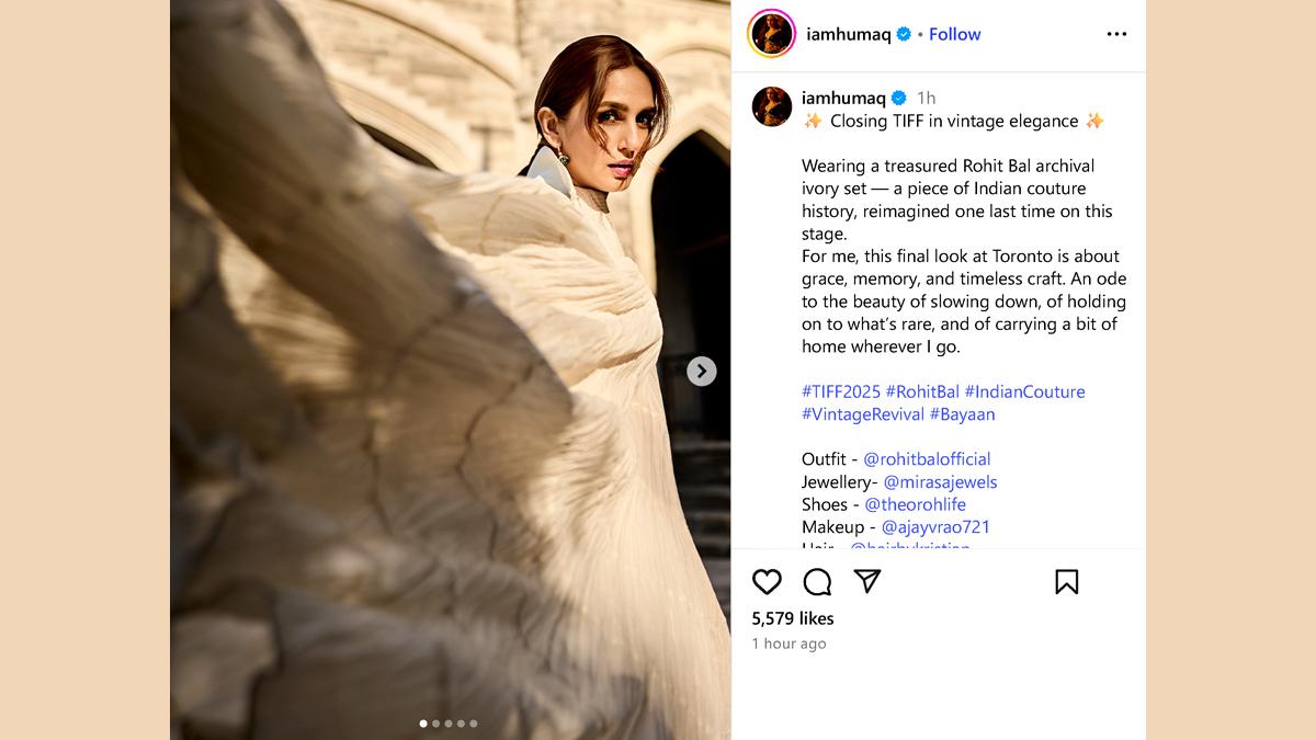 'Closing TIFF in vintage elegance. Wearing a treasured Rohit Bal archival ivory set -- a piece of Indian couture history, reimagined one last time on this stage,' she writes.