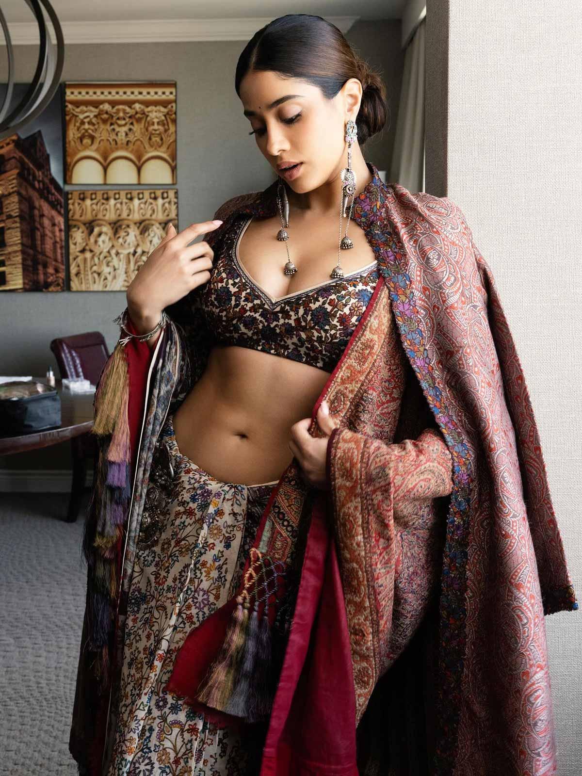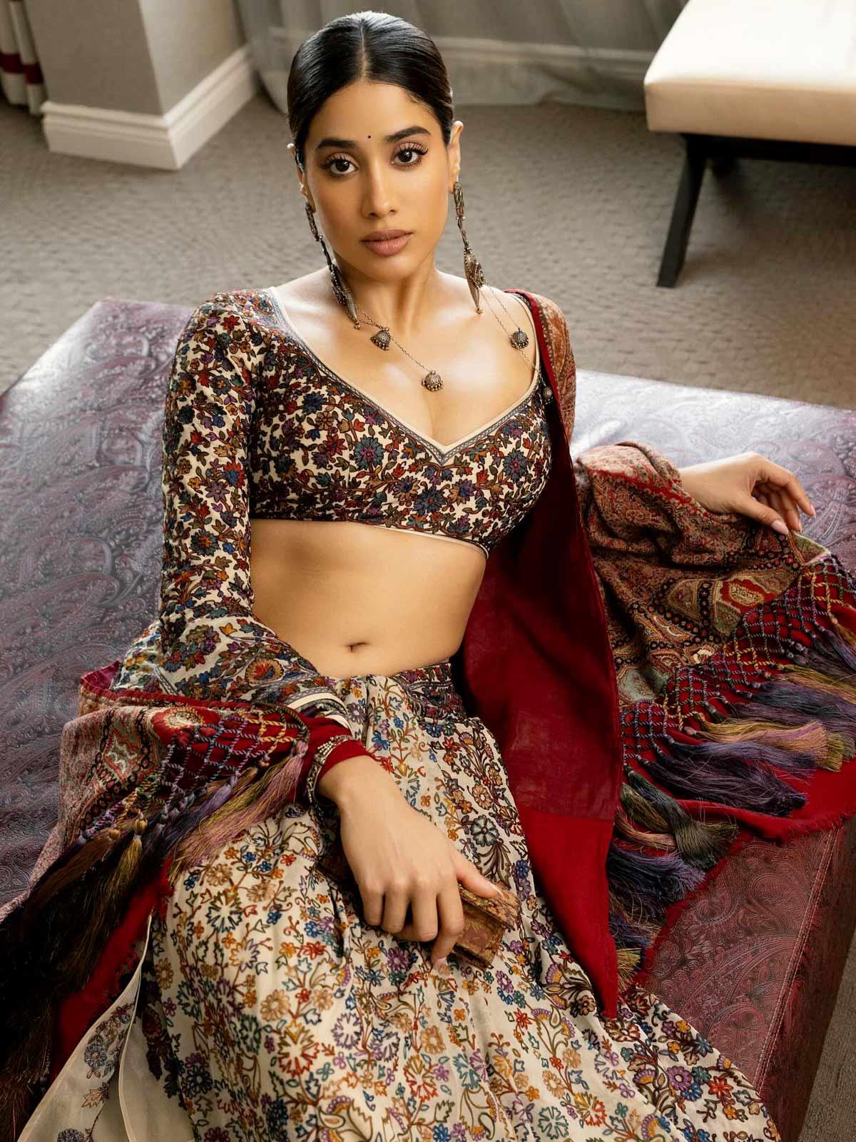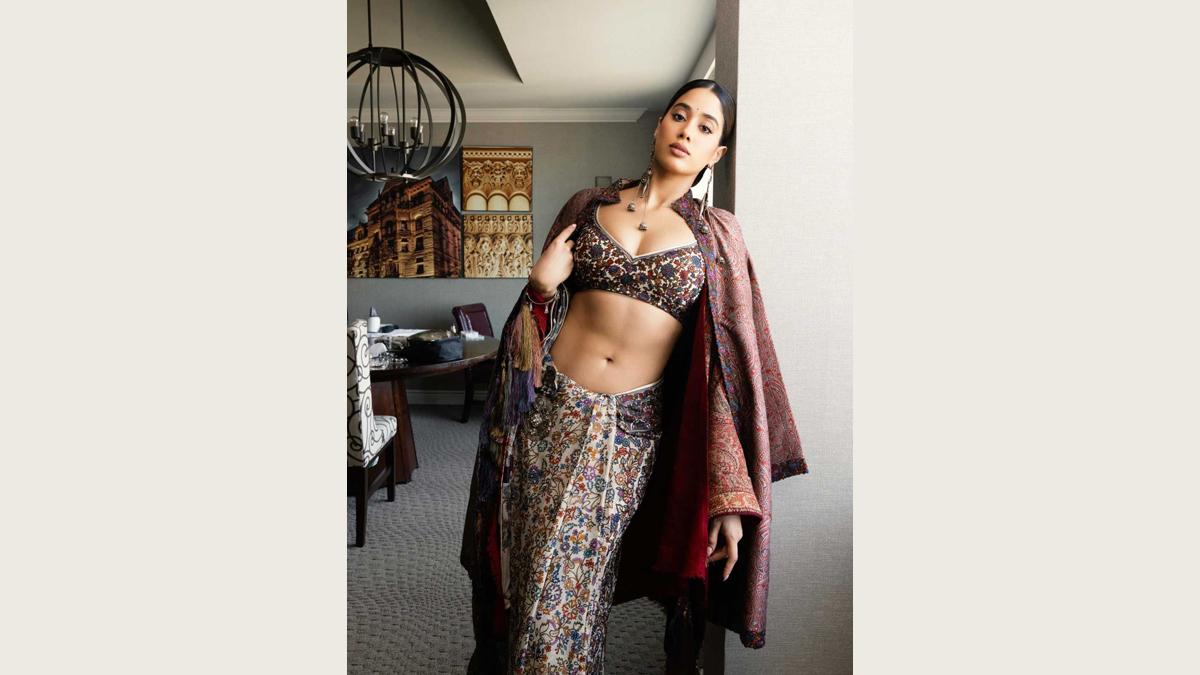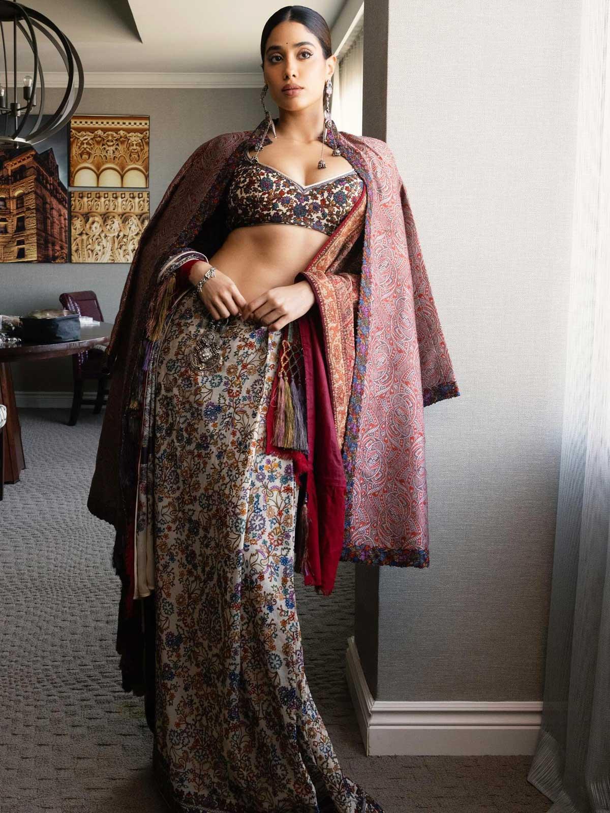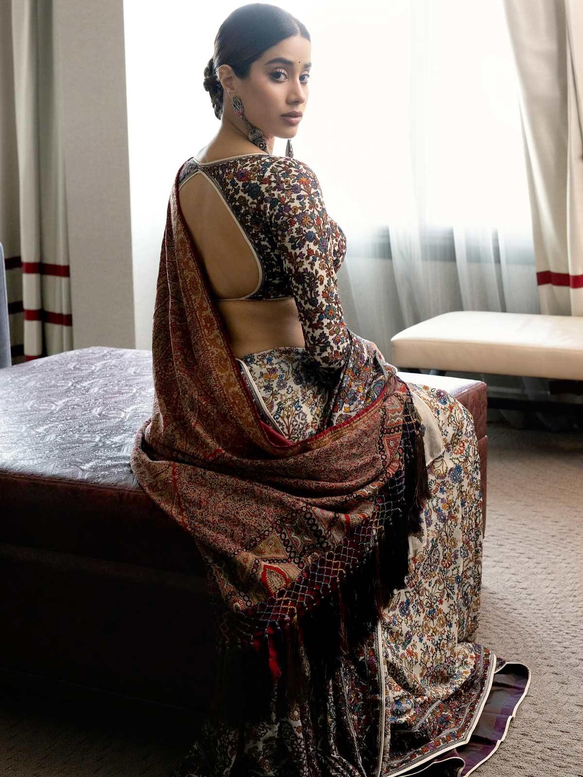 Rhea Kapoor shares pictures of Janhvi's look and explains it: 'Janhvi wears a resham sari by Abu Jani Sandeep Khosla, inspired by the colours and motifs of jamavar, paired with an antique jamavar shawl from the stylist's own collection, adorned with hand-made silk resham tassels.