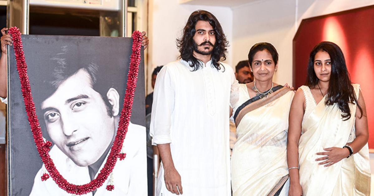 Vinod Khanna's wife, Kavita, son Sakshi and daughter Shraddha pose beside a portrait of the late actor.