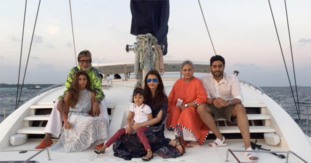 His father Amitabh Bachchan shared an adorable family picture on his Facebook page, above, and wrote, 'The family that stays together .. sails together.'