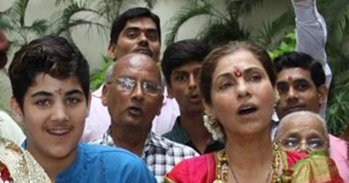 Dimple Kapadia joins daughter Twinkle Khanna and grandson Aarav Bhatia as they start for the Ganpati Visarjan from their residence in Juhu, a western Mumbai suburb.