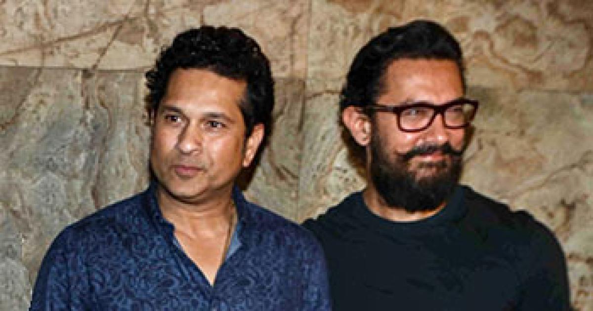 MNS founder Raj Thackeray with his wife Sharmila and cricket legend Sachin Tendulkar pose with Aamir Khan and his onscreen daughters Fatima Sana Shaikh and Sanya Mahotra.