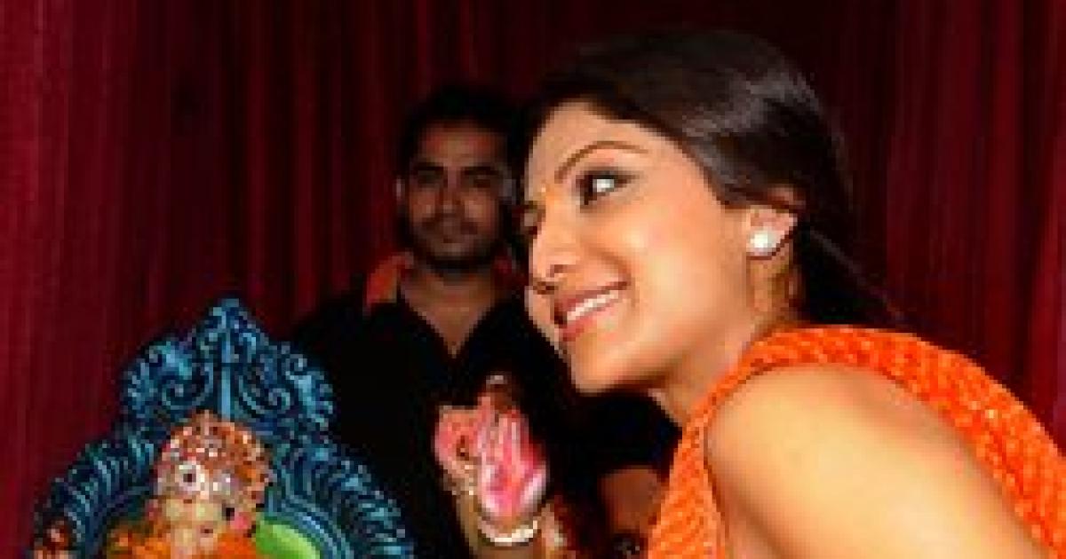 Shilpa Shetty, wjho sported a bright orange sari for the ceremony, is seen here with the deity before proceeding for visarjan.