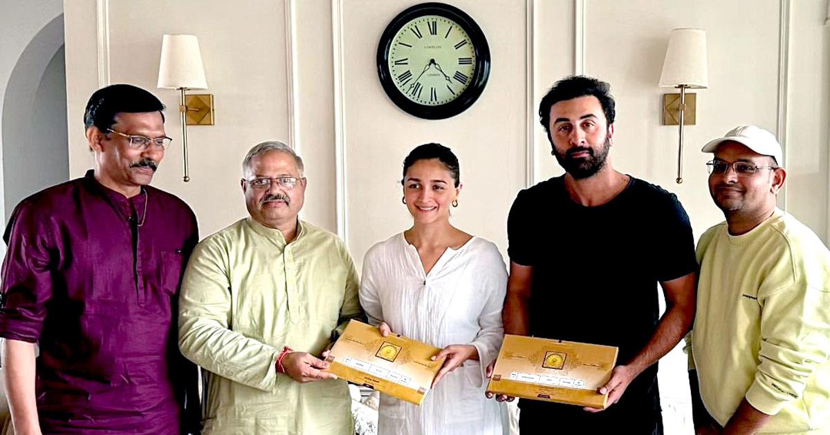 Alia and Ranbir were presented with bouquets and invitations to the Ram Mandir consecration ceremony.