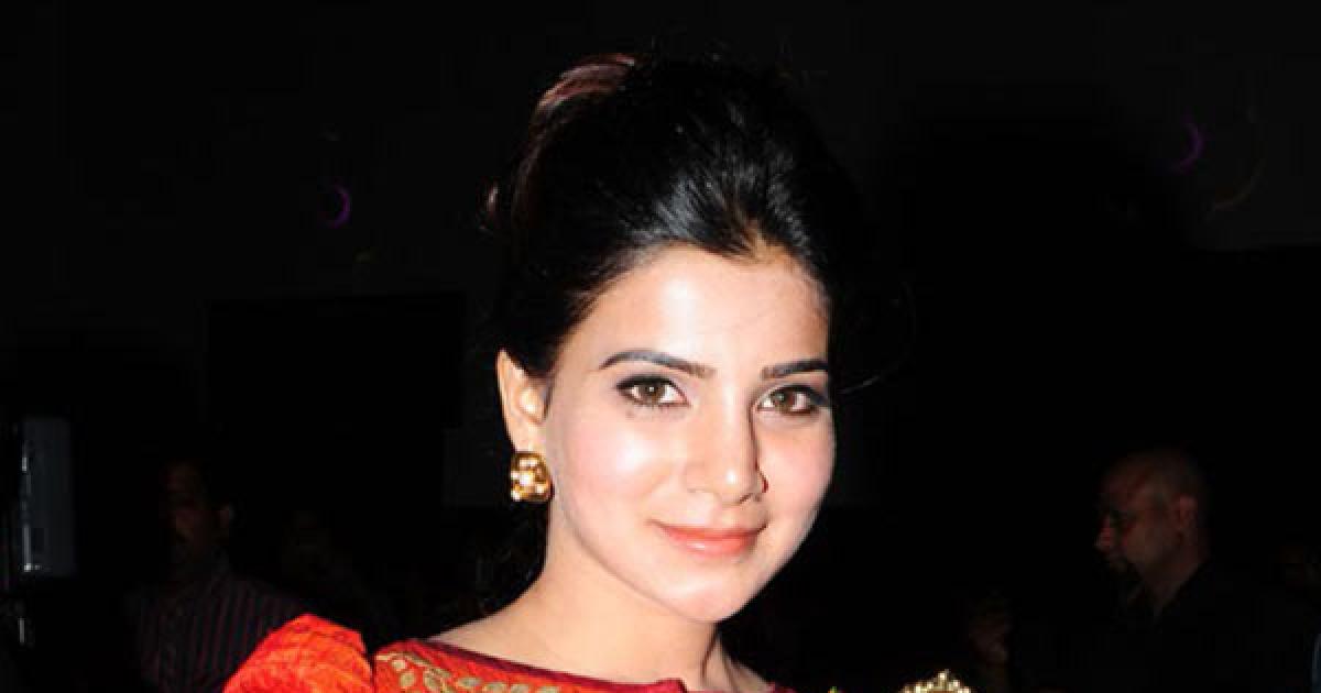 Actress Pranitha gives her thank you speech at the awards ceremony.