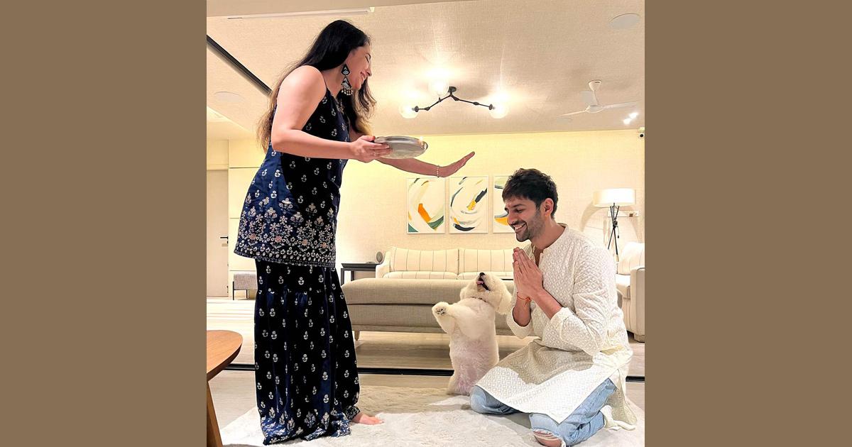 Even as Kartik and his pet Katori look cute taking blessings from his sister Kritika, we can't help but look beyond at the white and grey colours of his living room. It makes the space look classy, bigger and very inviting.