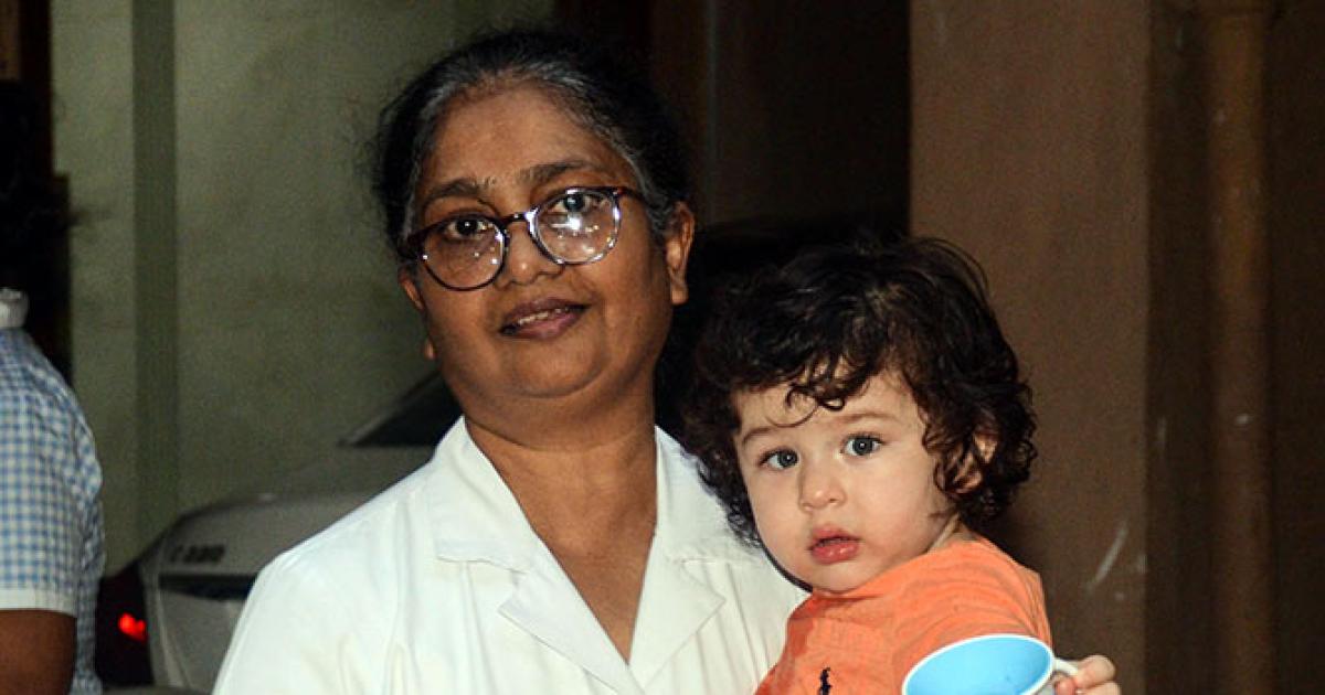 Taimur Ali Khan holds on to his sipper, as his nanny takes him out.