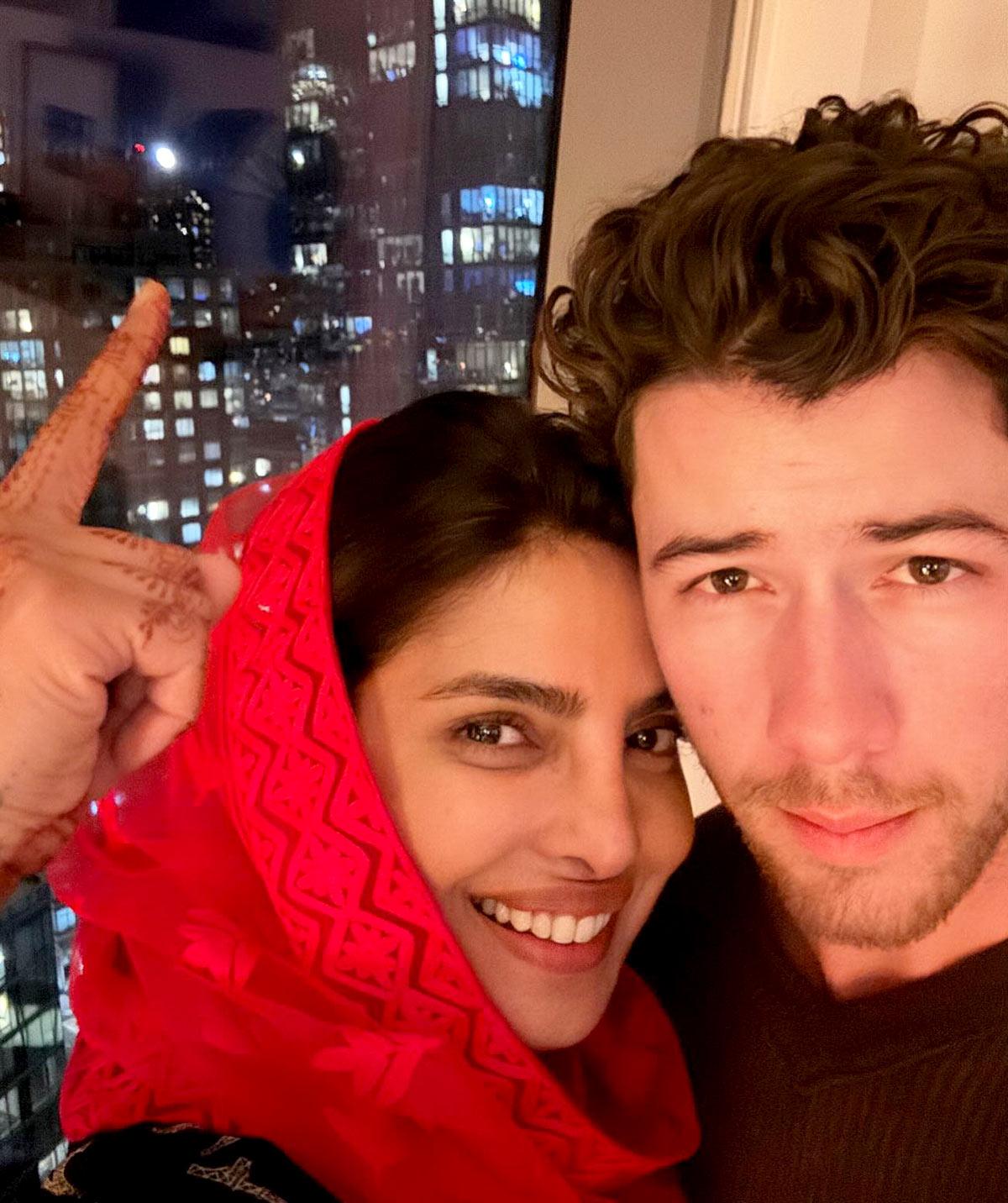 Priyanka Chopra celebrates with Nick Jonas and writes,'Surprise!! Daddy came home for karwachauth. In the middle of intense touring when he comes back home to make sure he spends Karva Chauth with me every year, when my mother-in-law sends me my Sargi the day before, and my mother brings back delicious food made by Vikas khanna from @bungalowny to break my fast.. this is what my dreams were made of. Thank you for being my true chaand Love you forever and always @nickjonas.'
