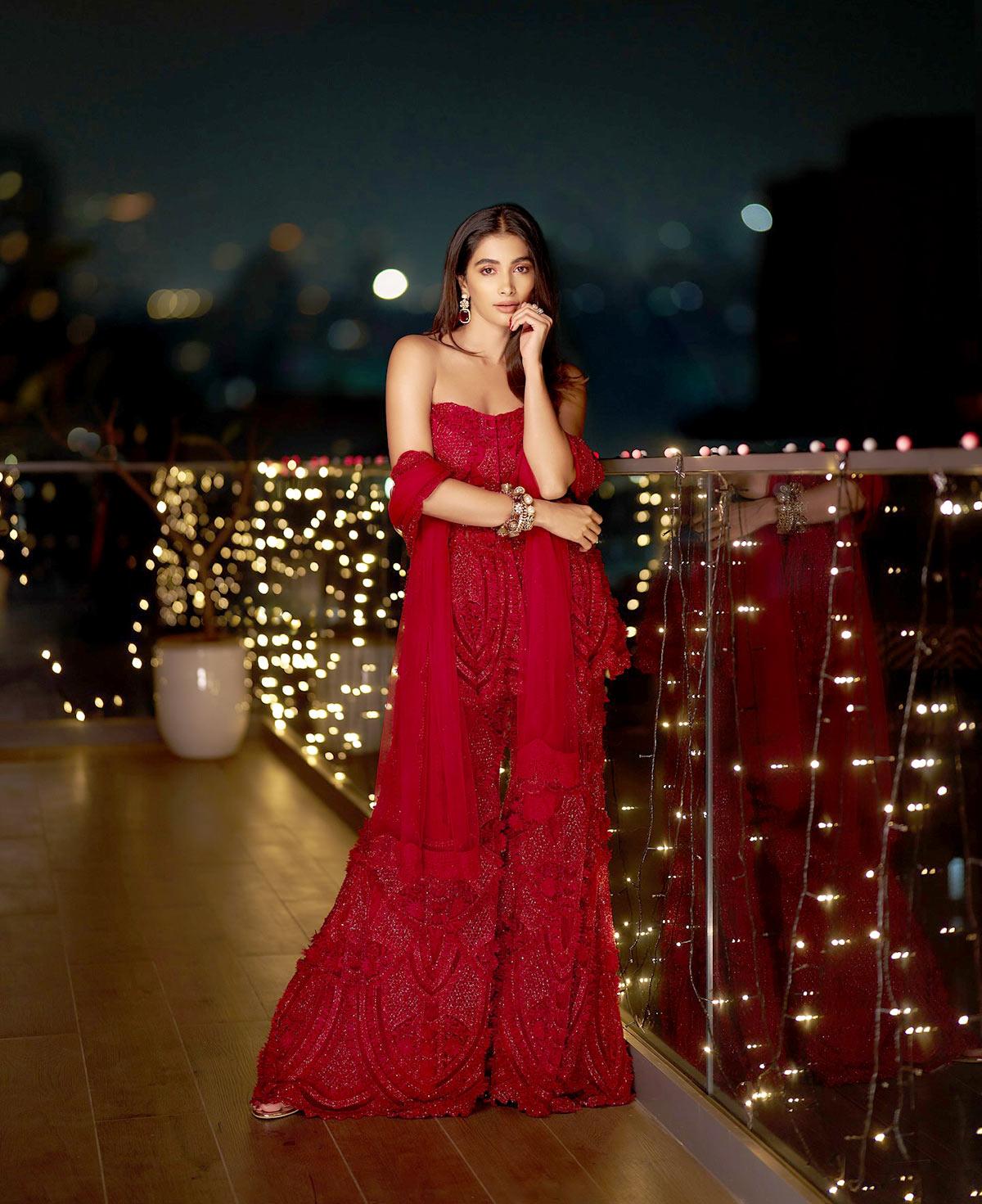 Pooja Hegde looks like a pataka in her heavily embellished, red peplum top, paired with matching flared pants and a dupatta.
