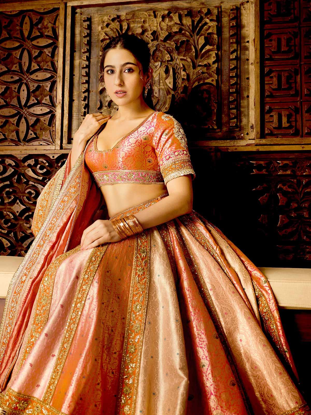 Sara Ali Khan makes a strong case for pastels in her apricot and peach toned brocade lehenga-choli designed by Manish Malhotra.