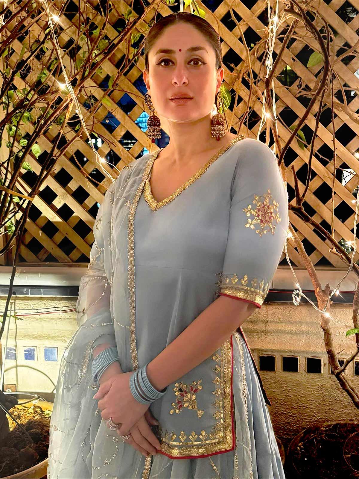 Kareena Kapoor Khan's powder blue and gold lehenga set looks stunning. It's easy on the eyes, yet without much drama.