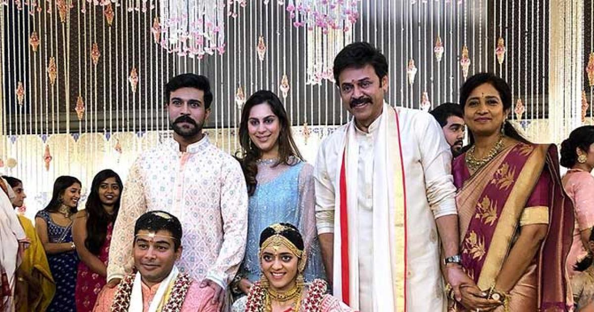 Aashritha Daggubati and Vinayak Reddy with Ram Charan Teja, his wife Upasana Kamineni, Venkatesh and his wife Neeraja.