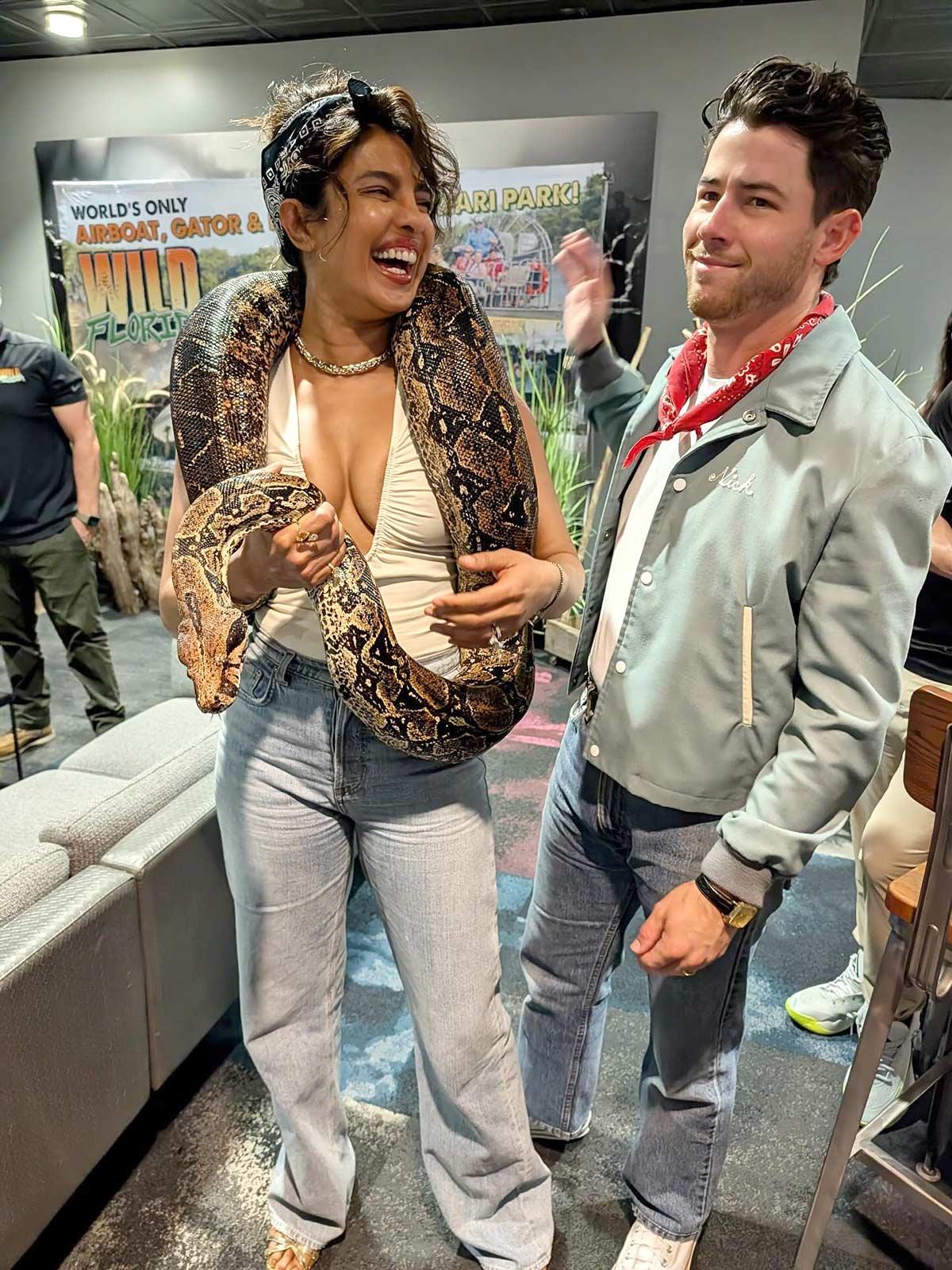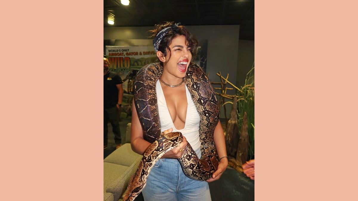 Priyanka Chopra, who is getting ready for her film with Mahesh Babu under S S Rajamouli's direction, shared some wild pictures with a giant python draped around her neck during her visit to the Wild Florida Adventure Park.