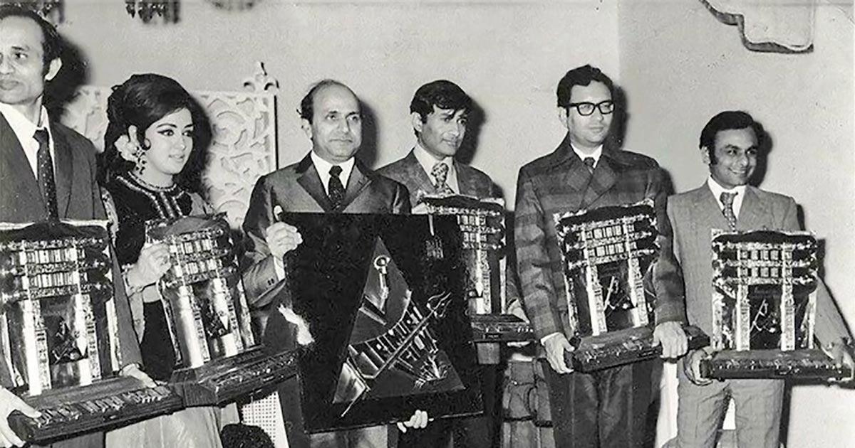 Gulshan Rai at the silver jubilee function of his first production, Johny Mera Naam with Dev Anand, Vijay Anand, Hema Malini and music composers Kalyanji-Anandji. Photograph: Kind courtesy Film History Pics/X