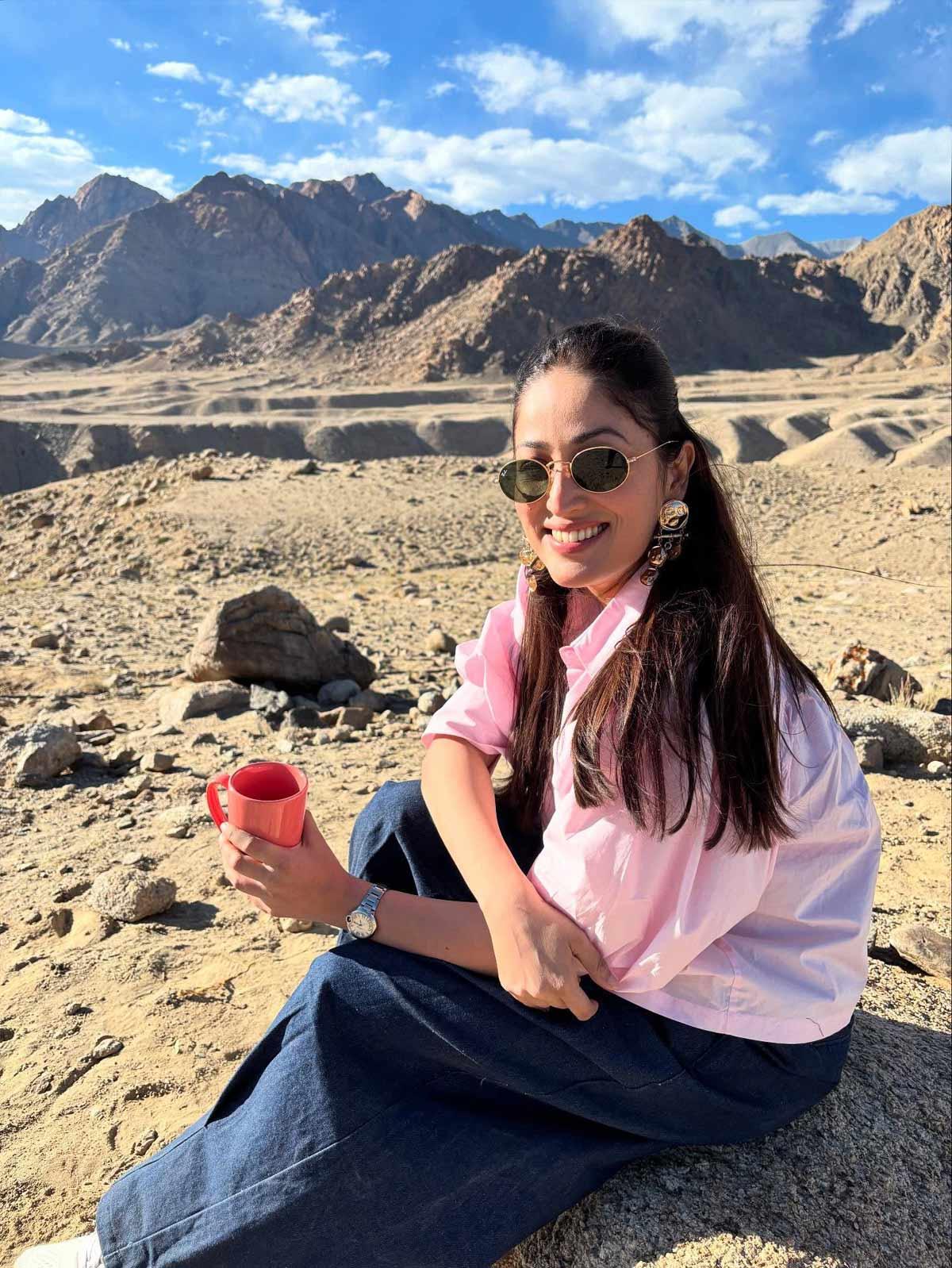 'The feeling of sipping Chai while nestled in the lap of mighty mountainous terrain of Leh, photo by my papa dear, while he holds his cup of Chai,' Yami writes.
