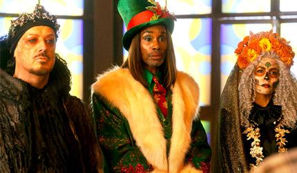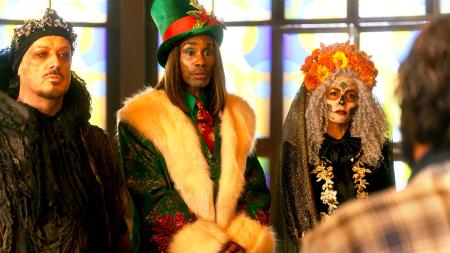 Just like in A Christmas Carol, Sood has a nightmare where he sees the ghost of Marley, who tells him that three more ghosts will be visiting: The Ghost of Christmas Past (Eva Longoria in Mexican Day of the Dead get up), the Ghost of Christmas Present (a campy Billy Porter), and the Ghost of Christmas Future (Boy George), each of whom shows Sood his life during these respective time periods.
