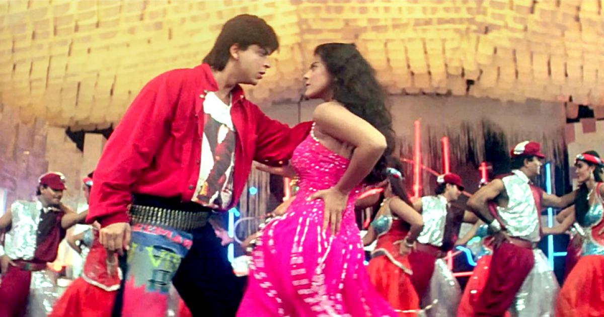 While his dream woman Juhi Chawla changes into a countless outfits, SRK's floral, fuchsia printed shirt in Tu Mere Saamne's fantasy song and dance stays put just like his unhealthy gaze on her.