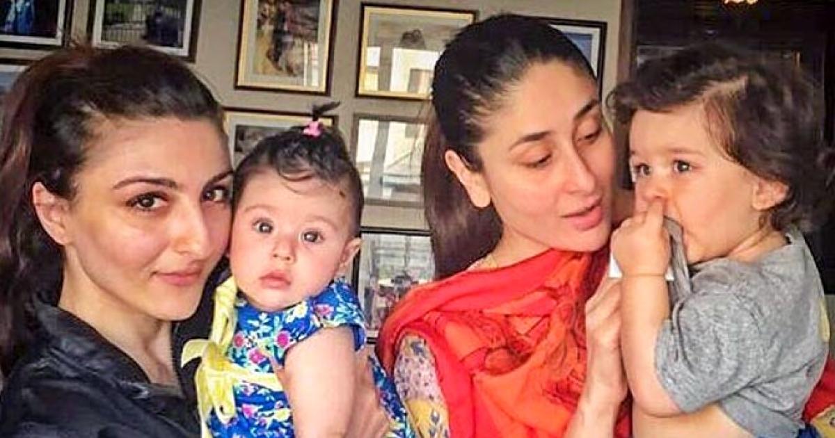 IMAGE: Soha Ali Khan and her sister-in-law Kareena Kapoor pose with their cuties, Inaaya and Taimur. Photograph: Kind courtesy Soha Ali Khan/Instagram