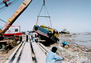Of course, the state government. Who has the control of law? Who has the control over revenue? You see, the port trust is a small organisation. We are not like some centrally administered territory. We are not Delhi or Chandigarh. It is being misquoted and misrepresented. They have all the powers. We are a port authority carrying out commercial functions. Our role and powers are limited. So evacuation is naturally the role of district and state authorities. Had only 10 people died, I don't think there would have been any controversy. You see, we took precautions, which is why only six out of 6,000 KPT employees died. Is that why the KPT is being blamed -- for saving its own people, caring two hoots for others? It is like saying that I am the owner of this land. Do I really own 220,000 acres of land? Do I really own what is larger than the state of Holland? Well, if the Bombay Port Trust owns much of south Bombay, can the BPT be held responsible for a casualty in Bombay? Where were you when the storm hit the port?