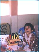 He is the oldest student in the school. He smiles and shakes hands with me. And speaks haltingly. He is receiving vocational training and is learning how to cut and paste pictures. He can identify colours.