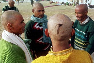 Devotees chat after getting their heads tonsured.