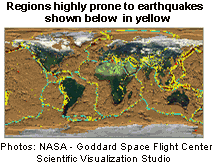 This ultra-slow motion, nevertheless, builds up enormous stress in the crust. If stress levels soar beyond a certain threshold, a portion of the crust will implode, moving suddenly, and, often times, violently. This sudden movement occurs along a fracture called the fault zone, where the earth's crust is weak. And that, folks, is an earthquake. Click here for animations of earthquake funda.